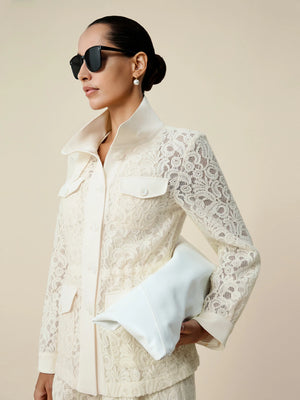 Fabric: Crafted with precision, this top showcases intricate laser embroidery, creating lifelike floral patterns with a refined texture. Made from a cotton-nylon blend, it offers breathability, durability, and a smooth, structured appearance.